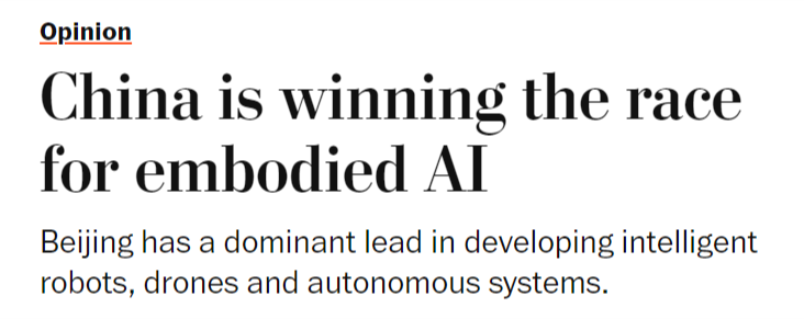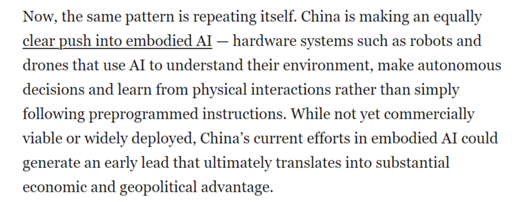 并最终为显著的经济取地缘劣势。成为全球具身人工智能系统的次要出产核心。整个2024年,这将使中国成为智能机械人和自从平台的次要全球供应国,从而为其带来强大的地缘经济影响力。中国可凭仗现有的制制劣势,这本不该如斯令人不测。中国正以同样明白的力度进军具身人工智能范畴——即机械人、无人机等硬件系统操纵AI、自从决策并从物理交互中进修。